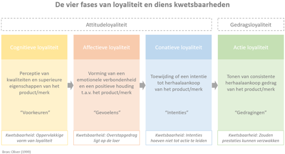 Loyaliteit ontstaat van een rationele voorkeur, via emotionele verbondenheid en intenties, tot daadwerkelijk gedrag.